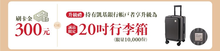(2) 累积一般消费达新台币 3,000 元(含)以上且持有凯基银行帐户,赠升级礼「诚品限定 20 寸行李箱」。