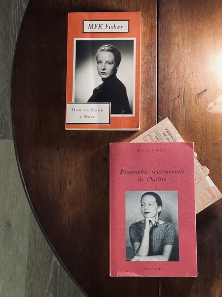 法文版《牡蛎之书》(下),以及英文版《如何煮狼》,皆是以费雪肖像为封面的版本。(摄影/游惠玲)