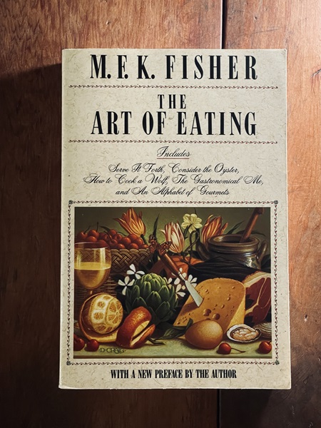 从伦敦二手书店搬回来的《The Art of Eating》(饮食之艺),最早於 1954 年出版,集结《Serve It Forth》(即刻上菜)、《Consider the Oyster》(牡蛎之书)、《How to Cook a Wolf》(如何煮狼)、《The Gastronomical Me》(我的饮食岁月)及《An Alphabet for Gourmets》(美食家的人生字典)等五书,为费雪代表作,後来多次再版,已成饮食文学经典。(摄影/游惠玲)