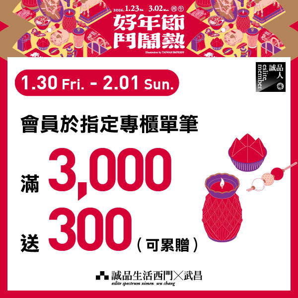 ● 「诚品线上$666电子抵用券」限诚品线上单笔消费满6,666可抵用(1.23-1.29 每日限量400张;1.30-2.16 每日限量200张),部分商品不适用,请依购物车显示为准。使用期限2026.1.23 Fri. - 2026.2.16 Mon.,逾期无效,恕不得转赠或累抵,详细使用规范依券面说明为准。