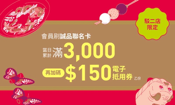 .「$150联名卡专属电子抵用券」限驳二店使用。诚品书店及以下专柜恕不得使用:expo、Starbucks星巴克。