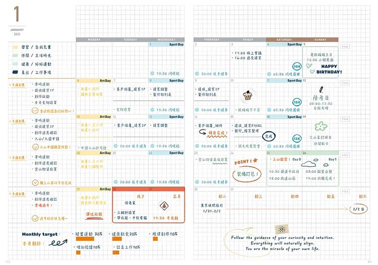版面配置精准有序,包含年历、横式及直式甘特图、月计画与周计画,从年度规划到每日细节全都包含在内。实际使用时,页内的方眼引导思绪,宽裕的留白则给予创作与记录的空间,工作排程、目标管理或随手速记都能让人专注於内容本身,静静陪你走过一年里的每个日常与成长。