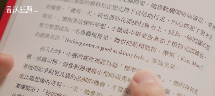 《容貌焦虑》一书也分享了模特儿小薇的故事,她立志成为专业模特儿,并将名模凯特·摩丝(Kate Moss)「瘦的滋味永远比美味的食物更棒」这句经典名言奉为圭臬。然而,她在参加国际品牌试镜时却屡屡受挫,被评价「不符合品牌形象」、「体态不够纤细」。为了迎合这些他人的要求,她持续加强节食和瘦身,最终引发健康上的问题。