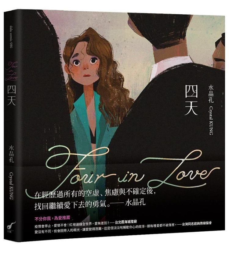 《四天(Four in love)》的繪者是擔任皮克斯動畫角色設計的美術家水晶孔(Crystal Kung),透過畫筆,接連描繪出愛情美好的、朦朧的、心碎和釋然的色彩,一幕幕如動畫略過眼前,忽遠忽近的視角,展現每個嚮往愛情的人們在期待與追尋的各種姿態。