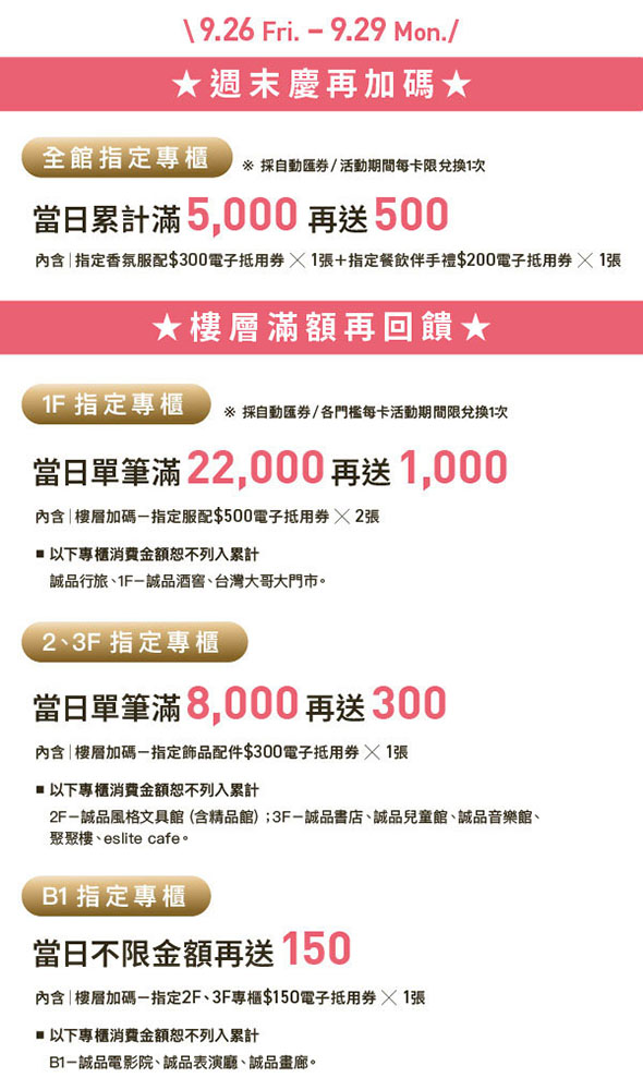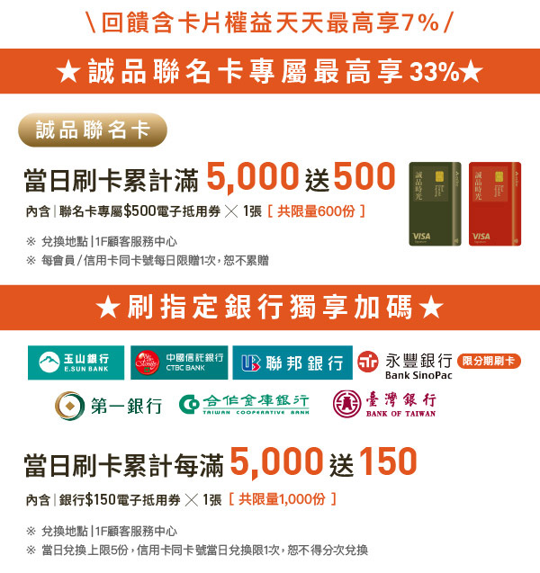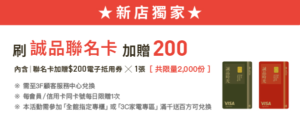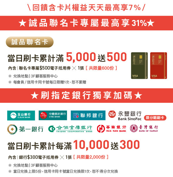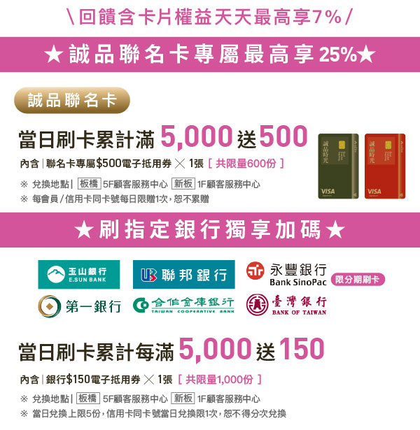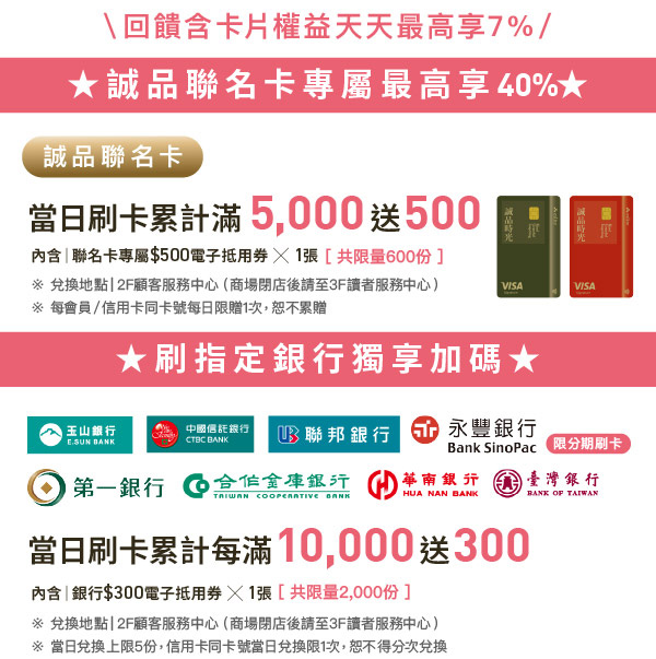 ▌「刷指定銀行獨享加碼」及「誠品聯名卡專屬」活動恕不得與館內「會員專屬銀行刷卡滿額禮」活動重複兌換。