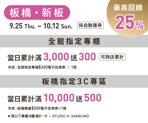 ▌「全館指定專櫃$300電子抵用券」、「銀行$150電子抵用券」及「聯名卡專屬$500電子抵用券」僅限板橋/新板館內使用,恕不得使用於全館臨時櫃、特賣會及以下專櫃,排除專櫃如有異動,以現場實際公告為準: