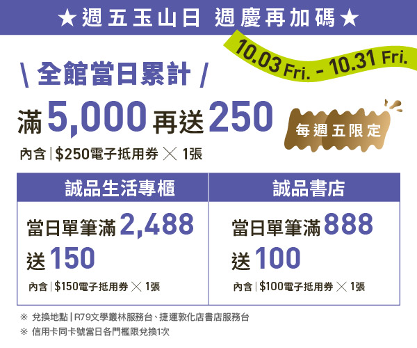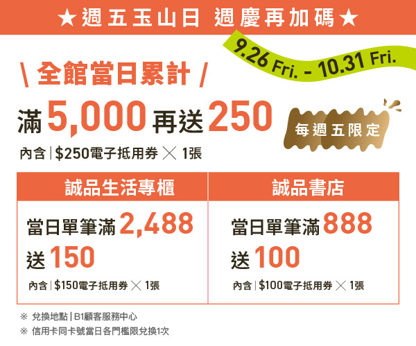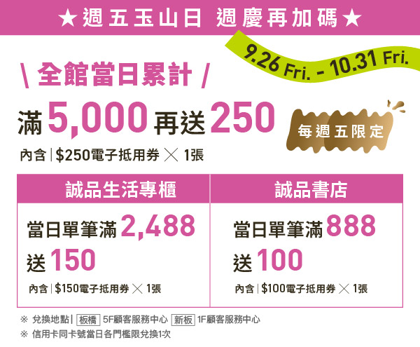 ▌「週五玉山日 週慶再加碼」活動注意事項請以迷誠品官網為準。