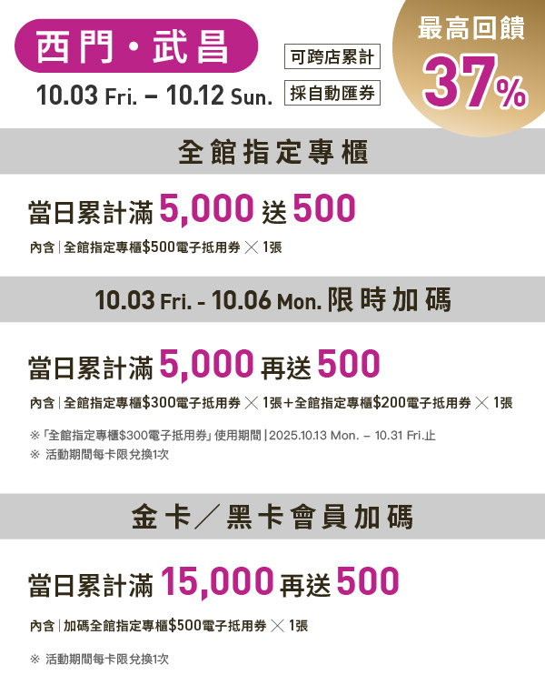 ▌「全館指定專櫃$500、$300、$200、加碼全館指定專櫃$500電子抵用券」、「銀行$150電子抵用券」及「聯名卡專屬$500電子抵用券」僅限西門、武昌館內使用,恕不得使用於全館臨時櫃、特賣會、限定店、快閃店及以下專櫃: