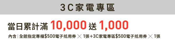 ▌限以下指定專櫃消費金額累計及使用「3C家電專區$500電子抵用券」: