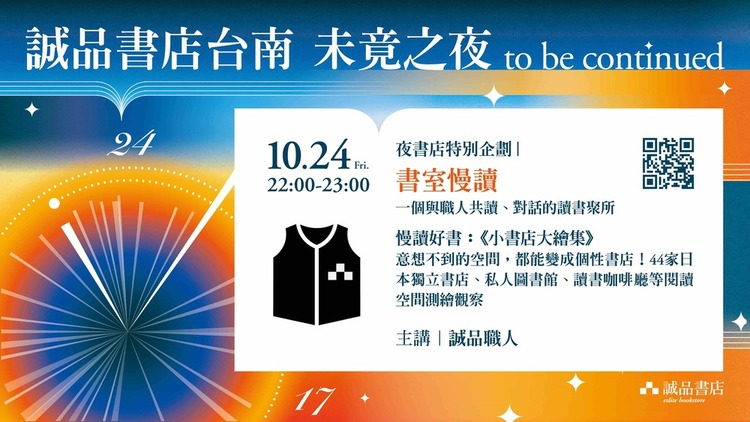 ➺誠品職人將帶領你一同慢讀好書:《小書店大繪集:意想不到的空間,都能變成個性書店! 44家日本獨立書店、私人圖書館、讀書咖啡廳等閱讀空間測繪觀察》。在寧靜的夜晚,與職人深度交流,發現閱讀的更多可能。