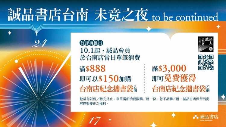 10/1起,為了感謝讀者的支持,限量台南店紀念攜書袋,溫暖再登場,讓你的閱讀旅程更添溫度。