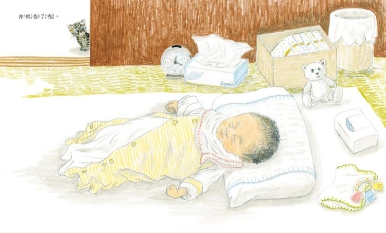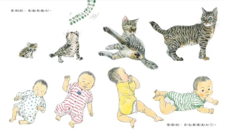 另外一個亮點是,在繪本中有一頁特別對比了貓咪和男孩的成長過程。可以發現貓咪的眼睛顏色隨著成長而改變,這是因為多數幼貓在兒時眼睛都是藍色,成長後才會展現品種特有的色澤。此外,貓咪抬起一隻爪子、翻身和抬頭等動作,也巧妙呼應了男孩嬰兒時期的姿勢,表達他們之間在生命中的連結。