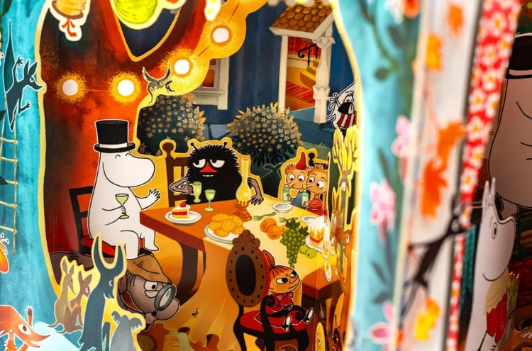 這本立體書最大的亮點,就是能展開成立體環狀書屋,每一面都像是一扇窗,悄悄打開姆明谷不同季節的風景——春天的甦醒、夏日的熱鬧、秋天的繽紛、冬季的靜謐。仔細一看紙雕細節,從角色的小動作、房屋的擺設到光影與色調的變化,都能感受到作者的巧思。