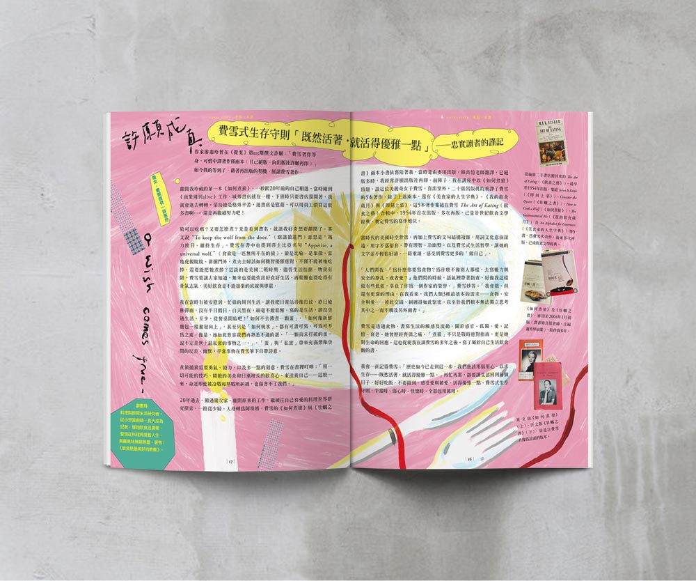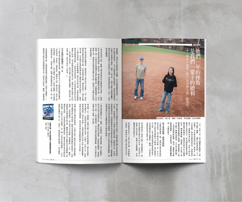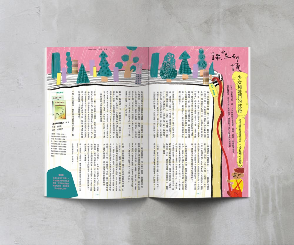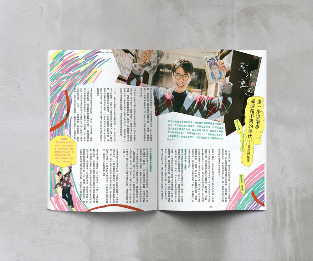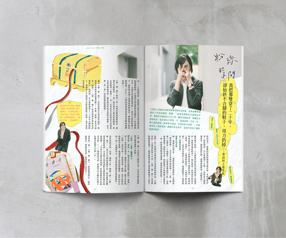 渡邊形容自己讀的書不多,但是喜歡把中意的書讀好幾遍,而他在十八歲那年遇見心目中最棒的作品,從此反覆讀著《大亨小傳》,不必重頭讀起就能立刻沉浸其中。本期封面故事,我們也好奇地發問大家,是否有一本無論讀了幾遍都不厭倦的書?並記錄了他們初遇那一本書,就此結下長久緣分的故事。作家馬欣讀的《舞.舞.舞》成了護身符般的存在,每當於職場適應不良時,她就想起羊男說的話;影像創作者鍾佳播在高中讀的漫畫《浪人劍客》則是如同藏寶箱,近幾年又讀,他從角色身上悟出新發現。