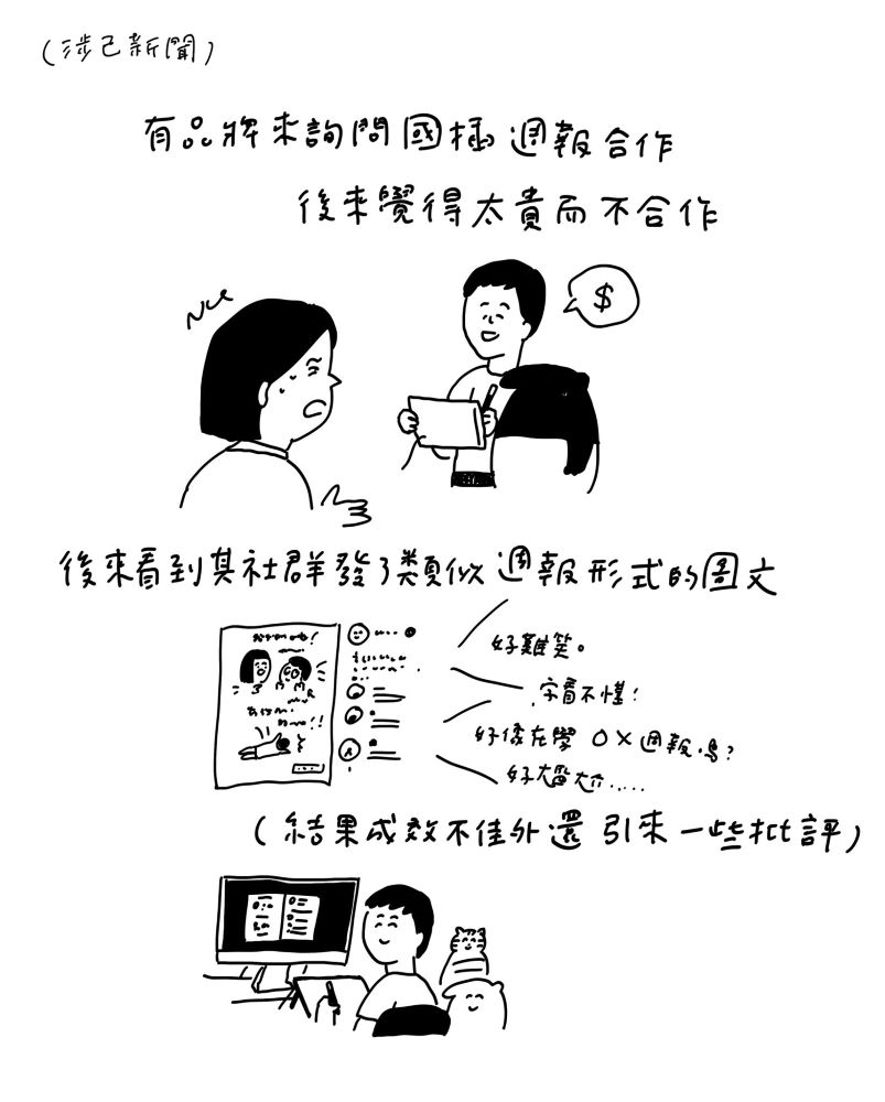 畫著大眾投稿,有時cherng 也會忍不住想加入戰局,畫自己的荒謬事。對此,他一率稱「涉己新聞」。首篇週報正是從這裡誕生⋯⋯