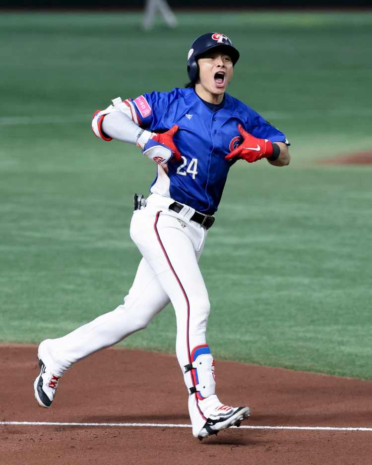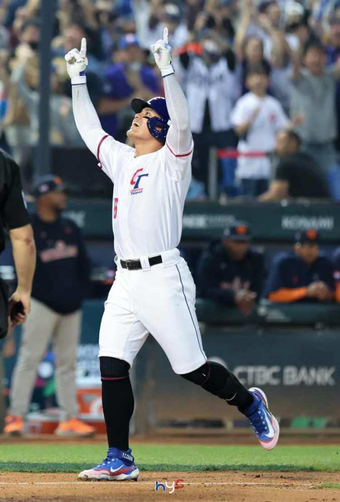 陳傑憲12強賽事中,打出3分全壘打,比出經典Team Taiwan 慶祝⼿勢。|侯禕縉 拍攝