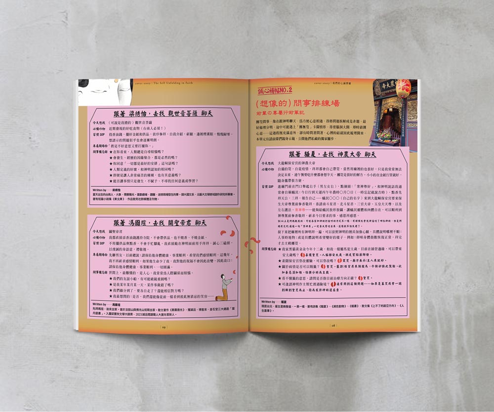 也不是真的沒有一丁點所謂「誠心」的人事物。比如傑尼細數街訪四年多來常見到「不見蹤影型」信眾:只見進廟,卻堵不到出廟。到底如何能有這麼多話好聊?我們找來三位世代各異的問事前輩騷夏、馮國瑄和梁綉怡,公開他們與神明的悄悄話:說些什麼、怎麼說,還有為什麼想說。