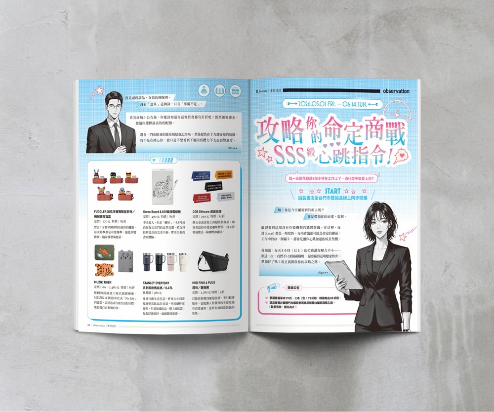 一本聚合日常閱讀與風格採買的書店誌,紙本刊物每月1日準時於全台誠品書店免費發刊。每期封面故事討論一個讀者關心的生活與消費的議題,推薦給讀者從中外文書籍、雜誌、影音或食品文具等多元商品。