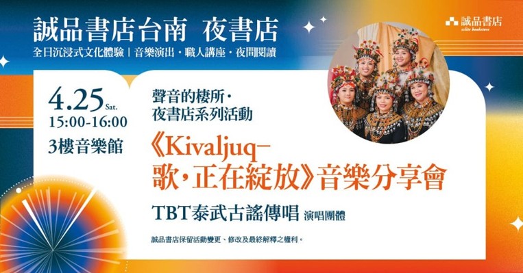 【夜書店系列活動】TBT 泰武古謠傳唱《Kivaljuq - 歌,正在綻放》音樂分享會