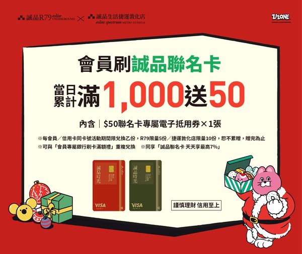 當日累計滿1,000送50 (內含|$50聯名卡專屬電子抵用券×1張)