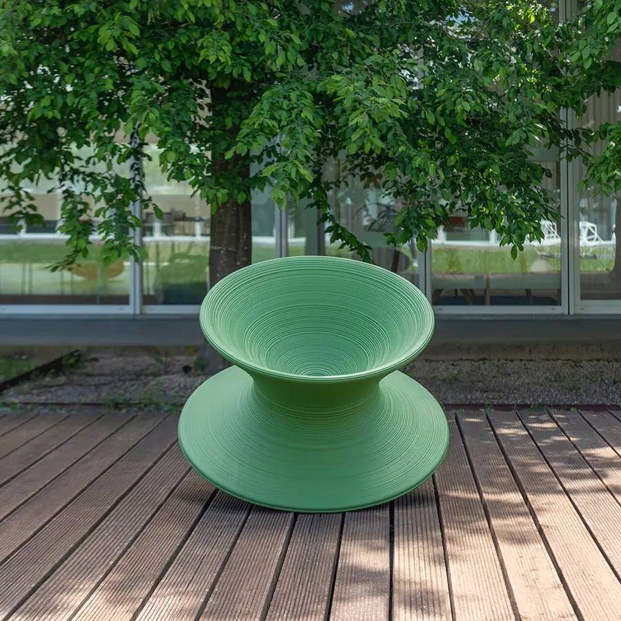 這個像是巨大手拉坏又像陀螺的物件其實是用來坐的椅子,同時還是個有趣的大玩具,嚴格來說更是一個裝置藝術品。